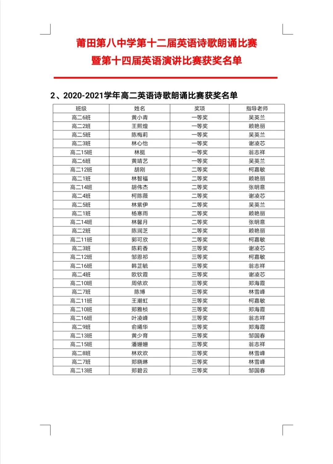 莆田第八中学第十二届英语诗歌朗诵比赛暨第十四届英语演讲比赛